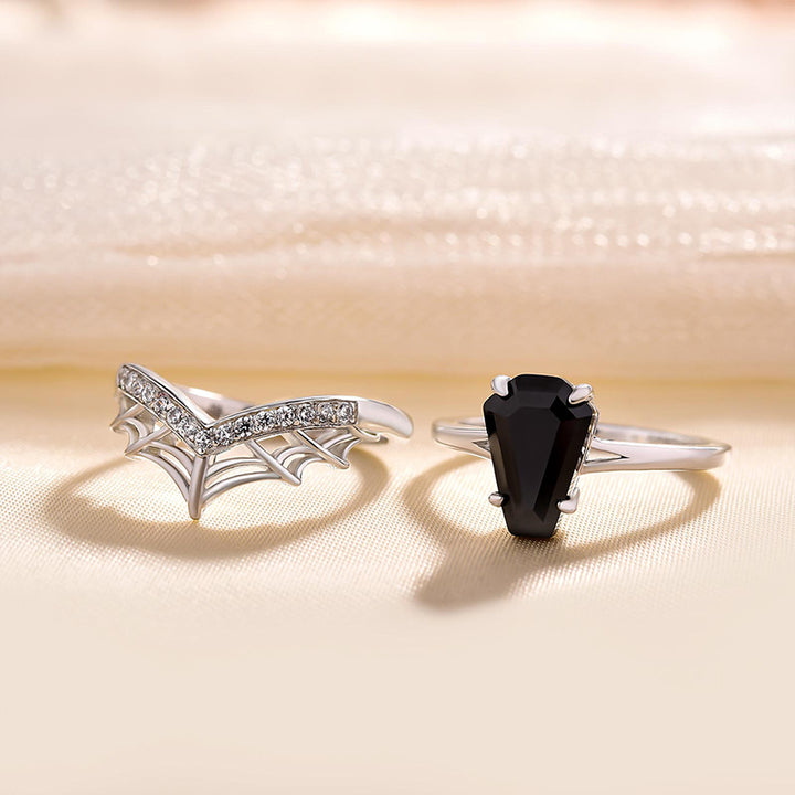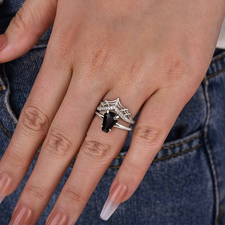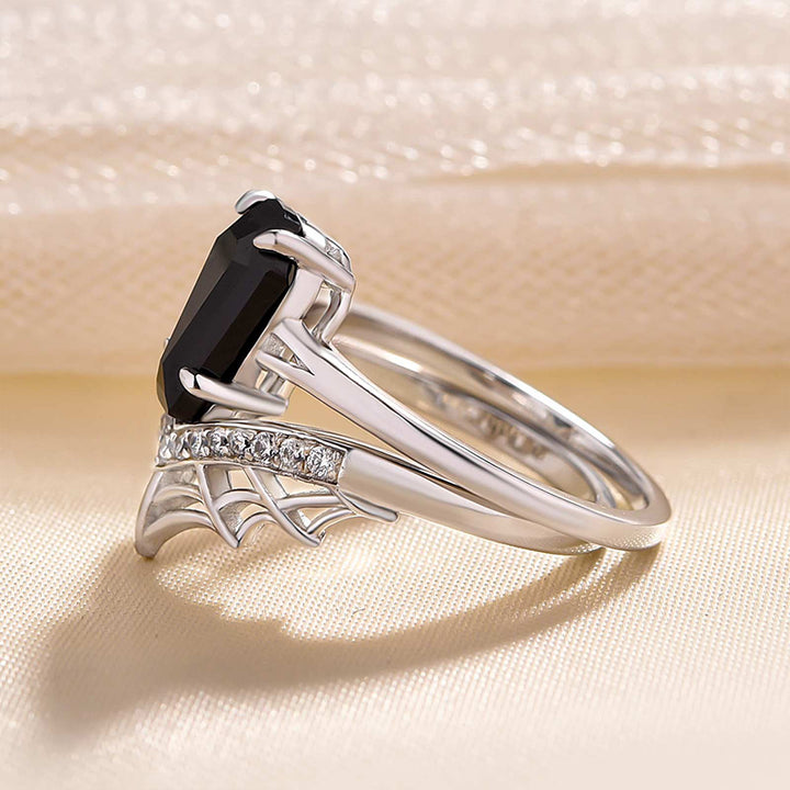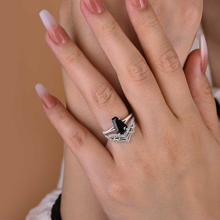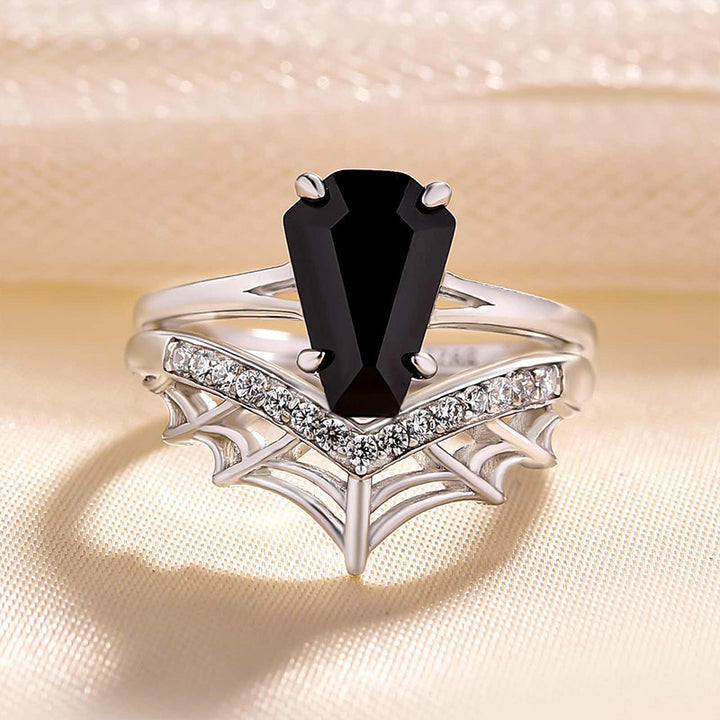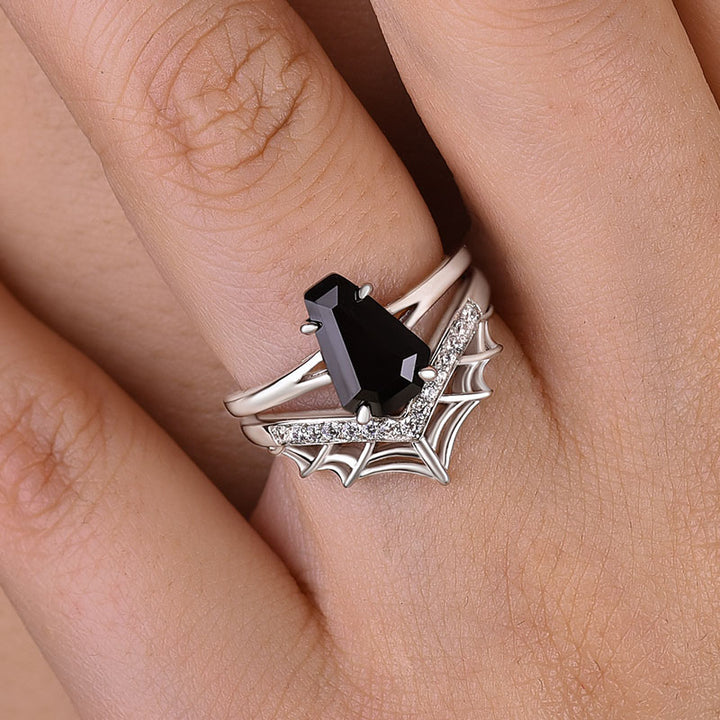 3.0 Ct Black Coffin Cut Onyx Bridal Ring Set | Spyder Web Pave Set in Solid Gold & Sterling Silver