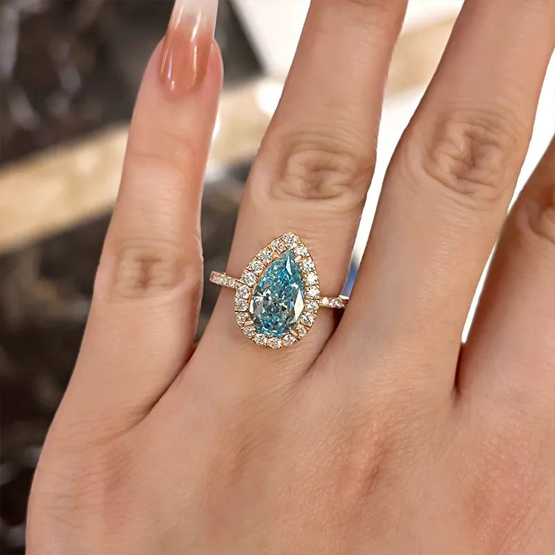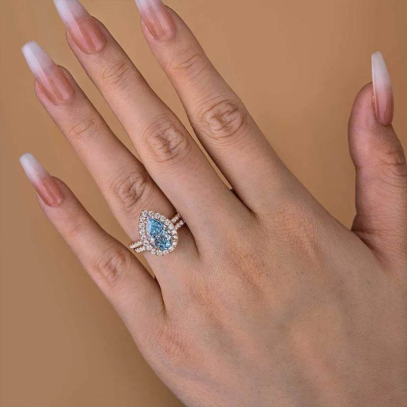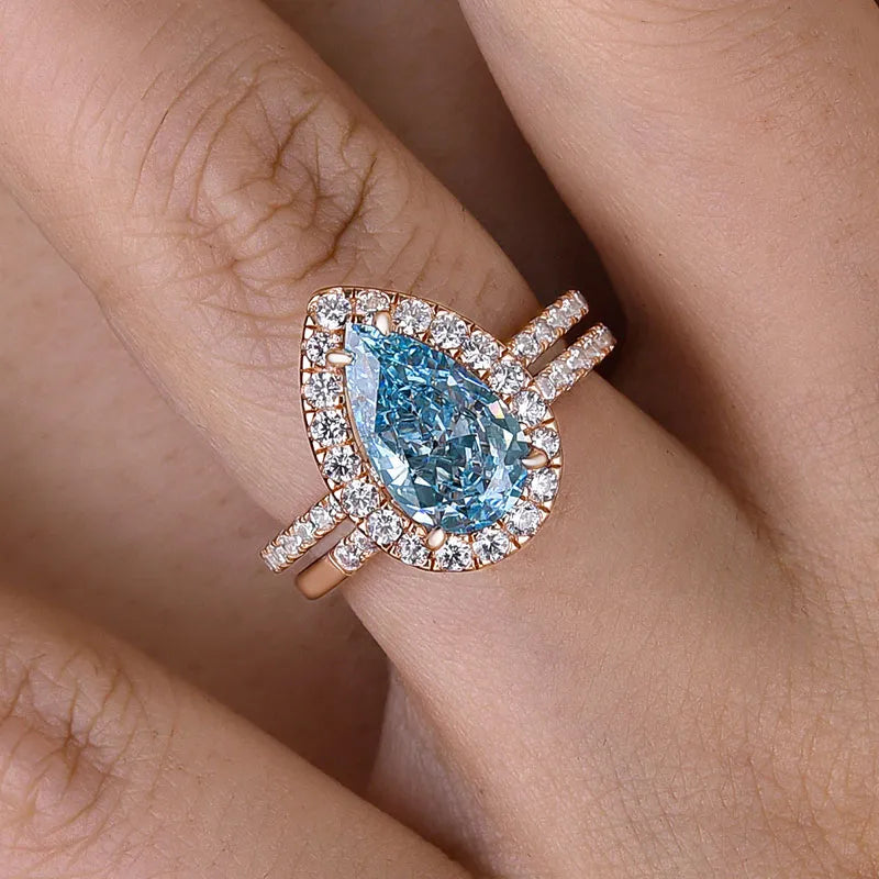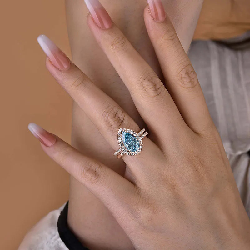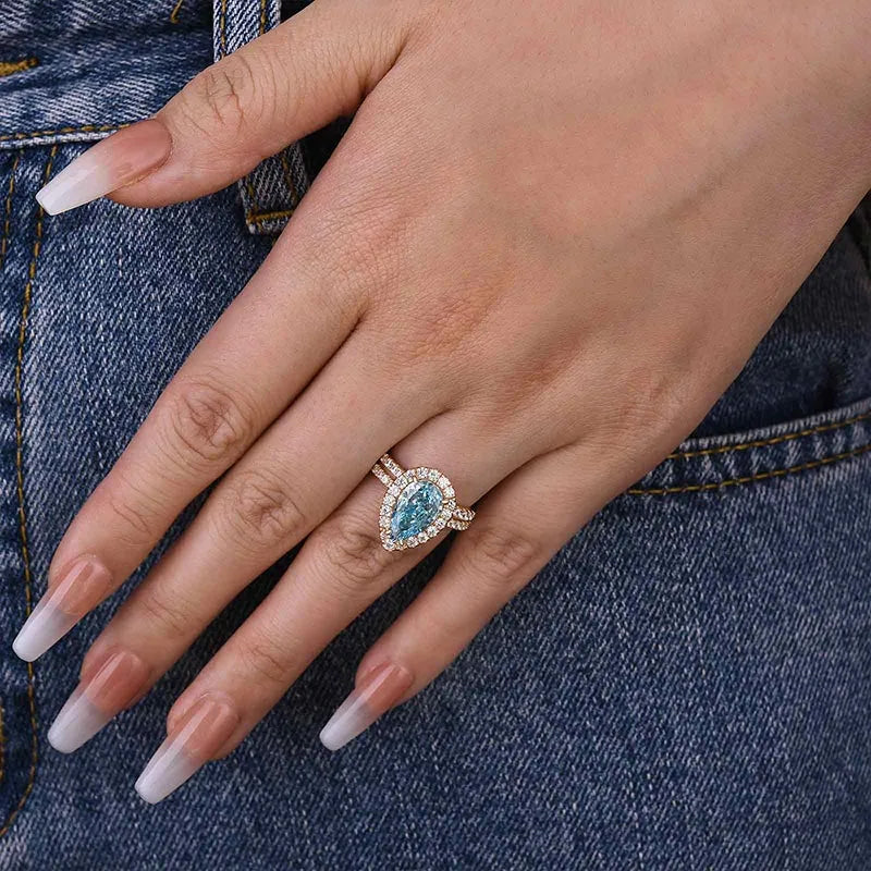 3.0 Ct Pear Cut Cyan Blue Bridal Ring Set | Sterling Silver & 18K Gold Engagement Ring