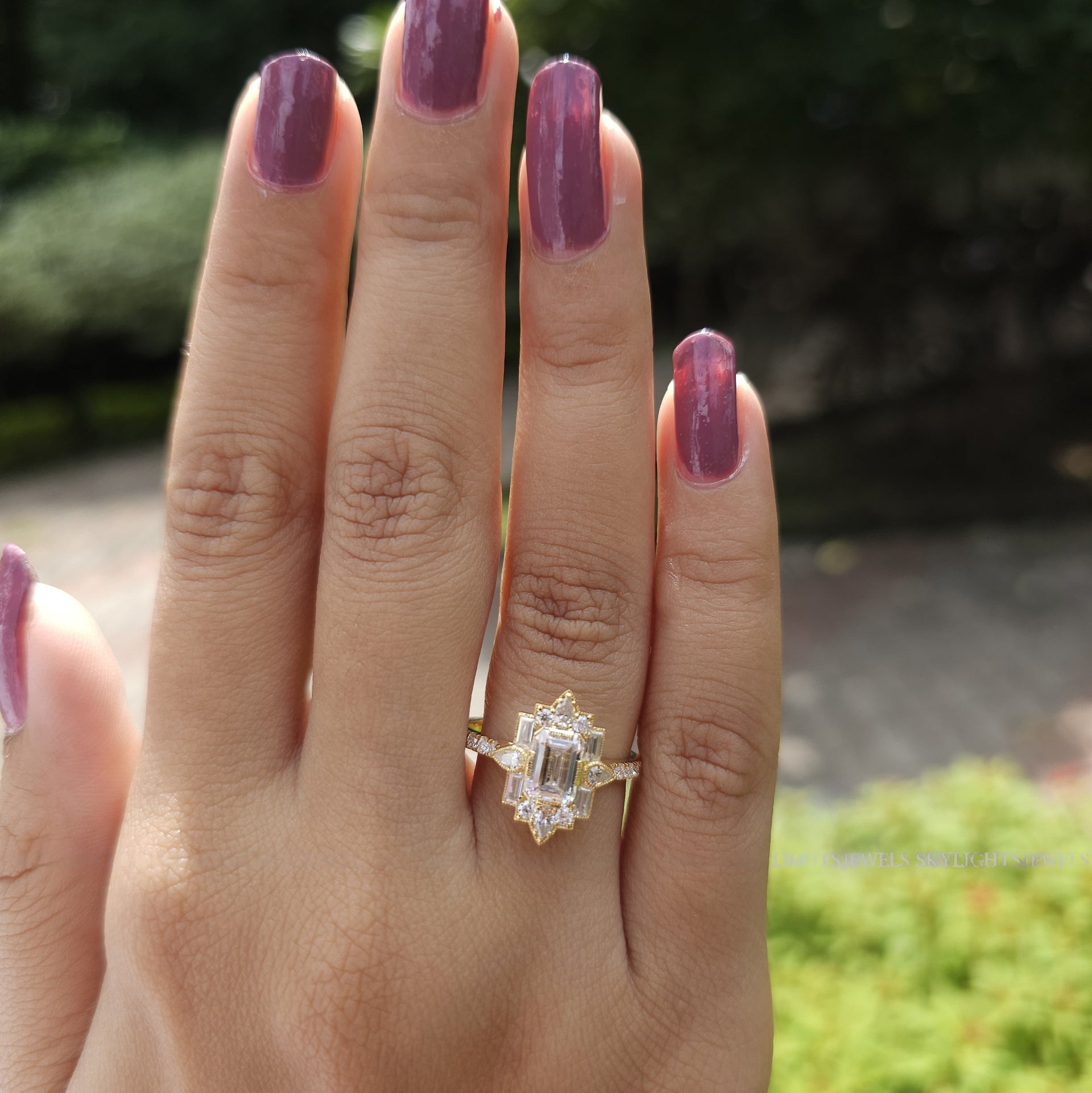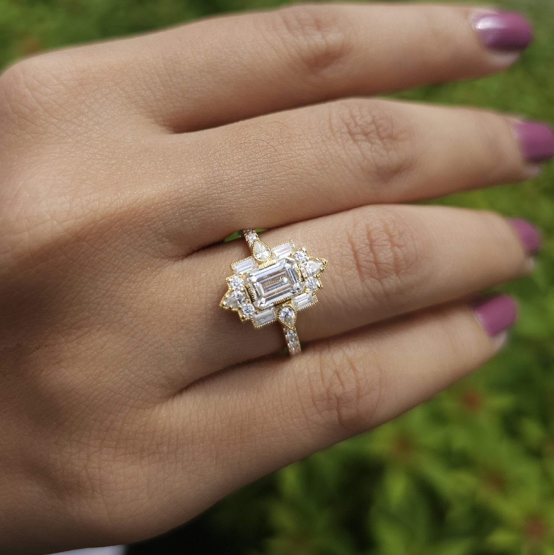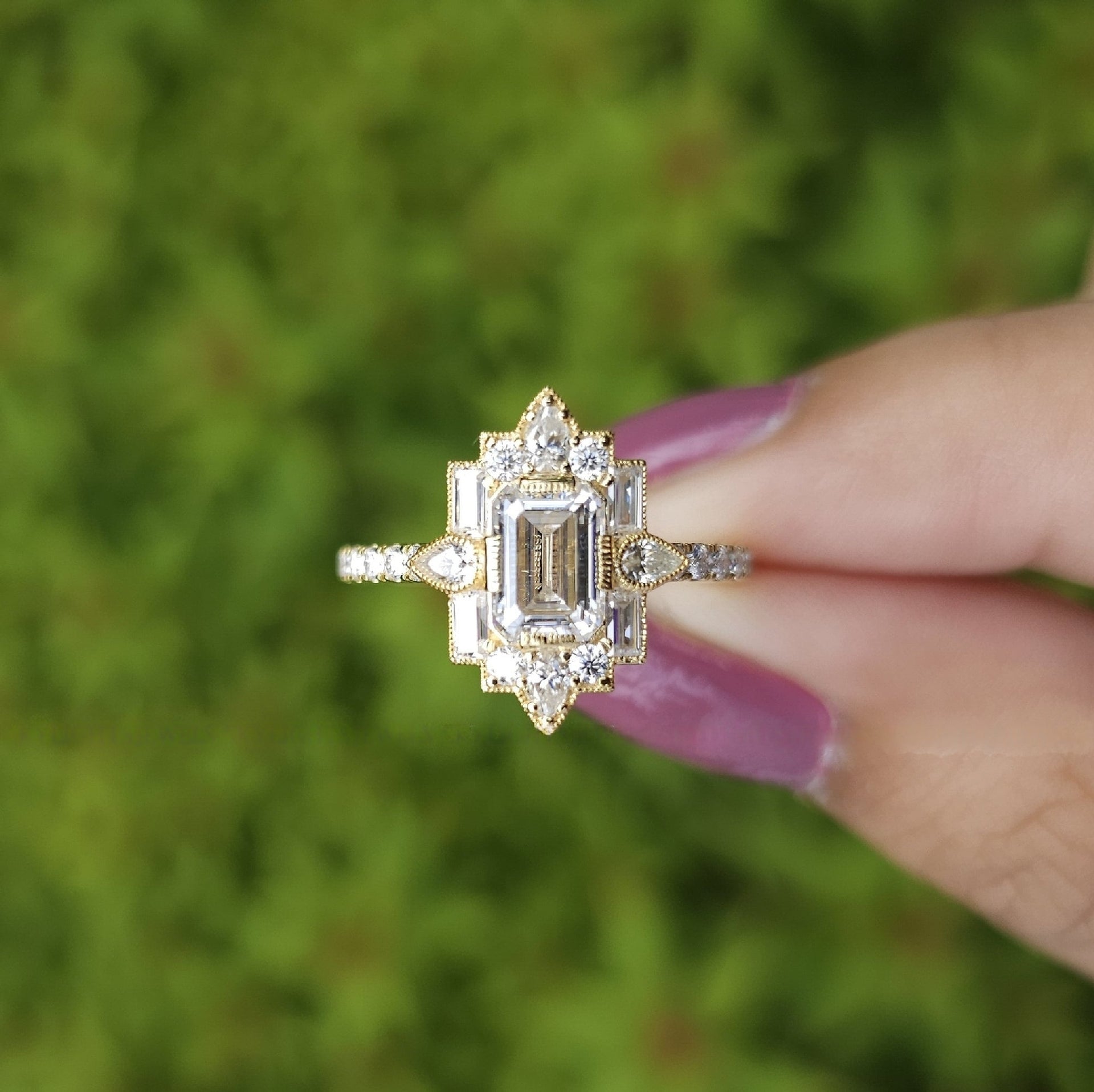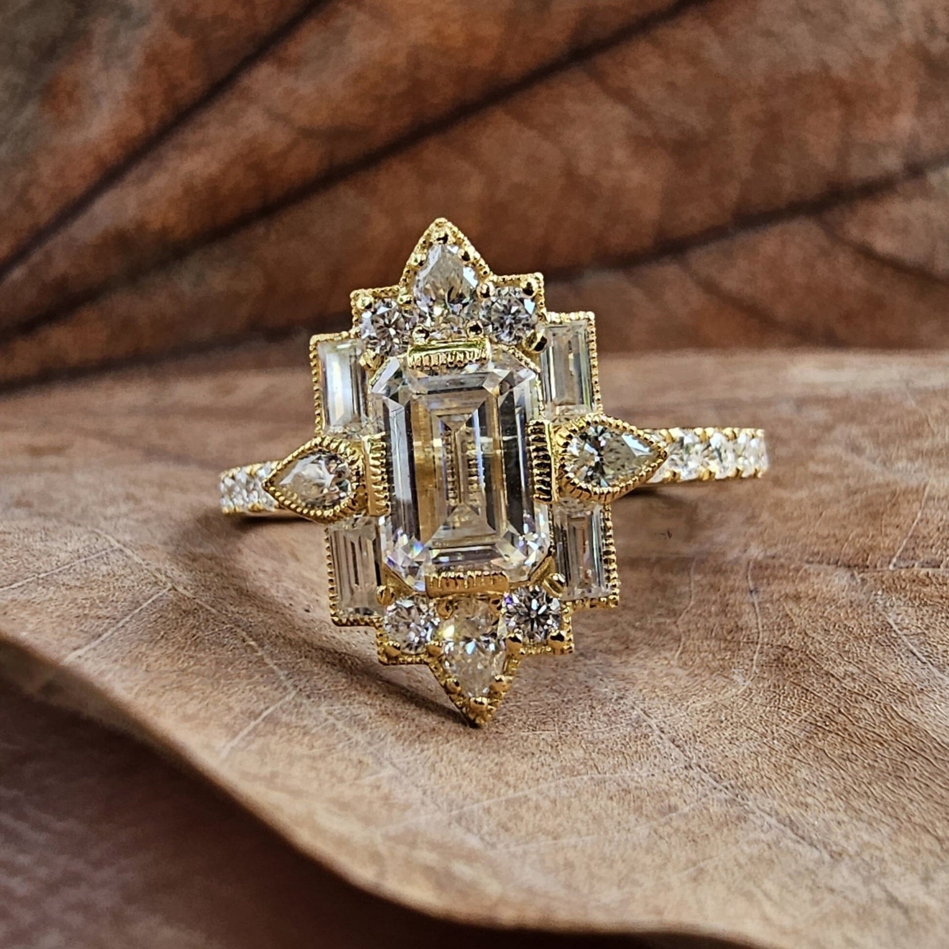 Discover timeless elegance with our Art Deco Emerald Cut Ring, featuring a stunning 1.5 CT Moissanite centerpiece and exquisite pear and round cut side stones. Crafted in a blend of 10K Gold and Sterling Silver, this ring combines classic Art Deco design with modern sophistication, making it an ideal choice for proposals, weddings, or as a standout piece in your jewelry collection.