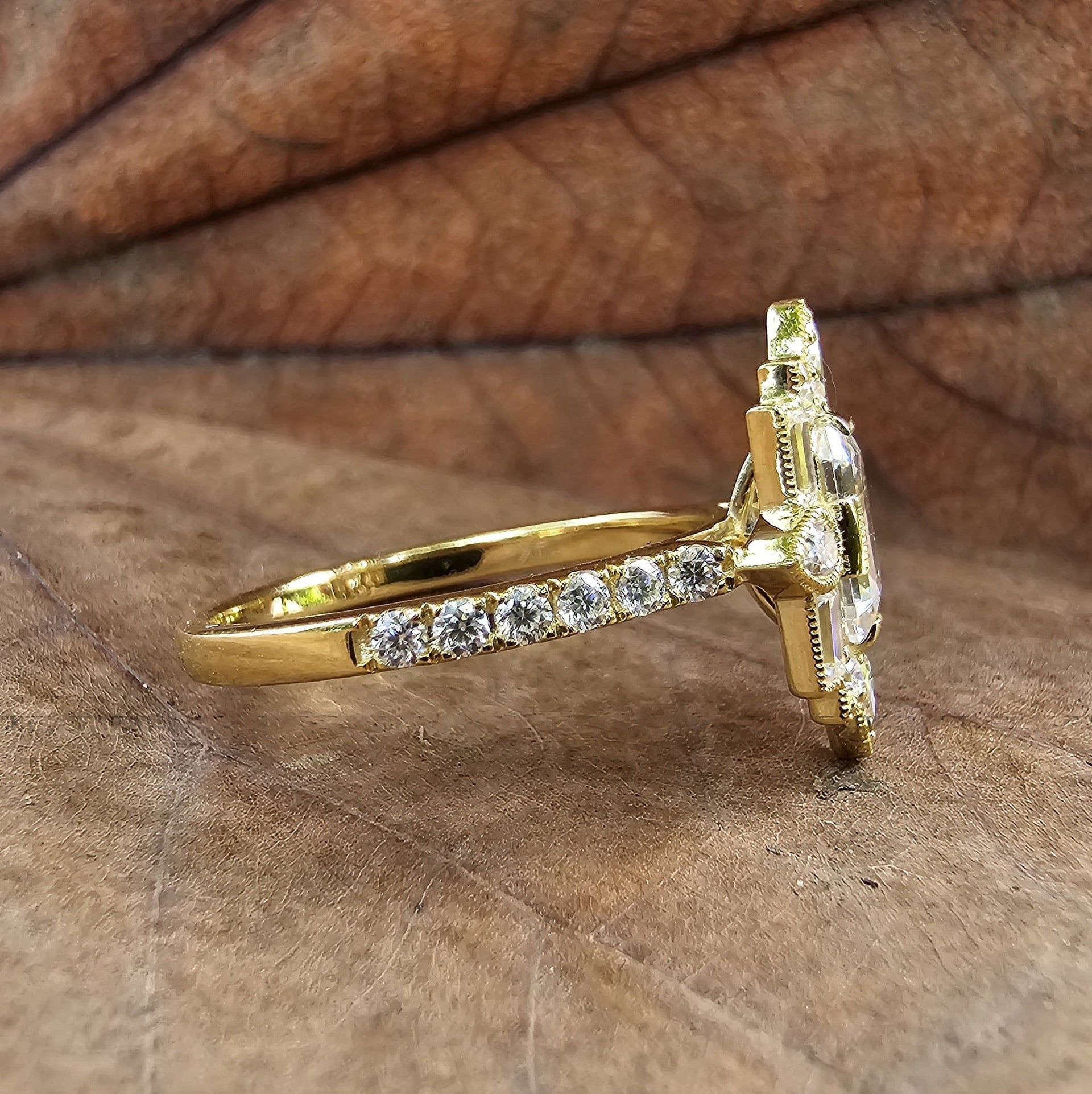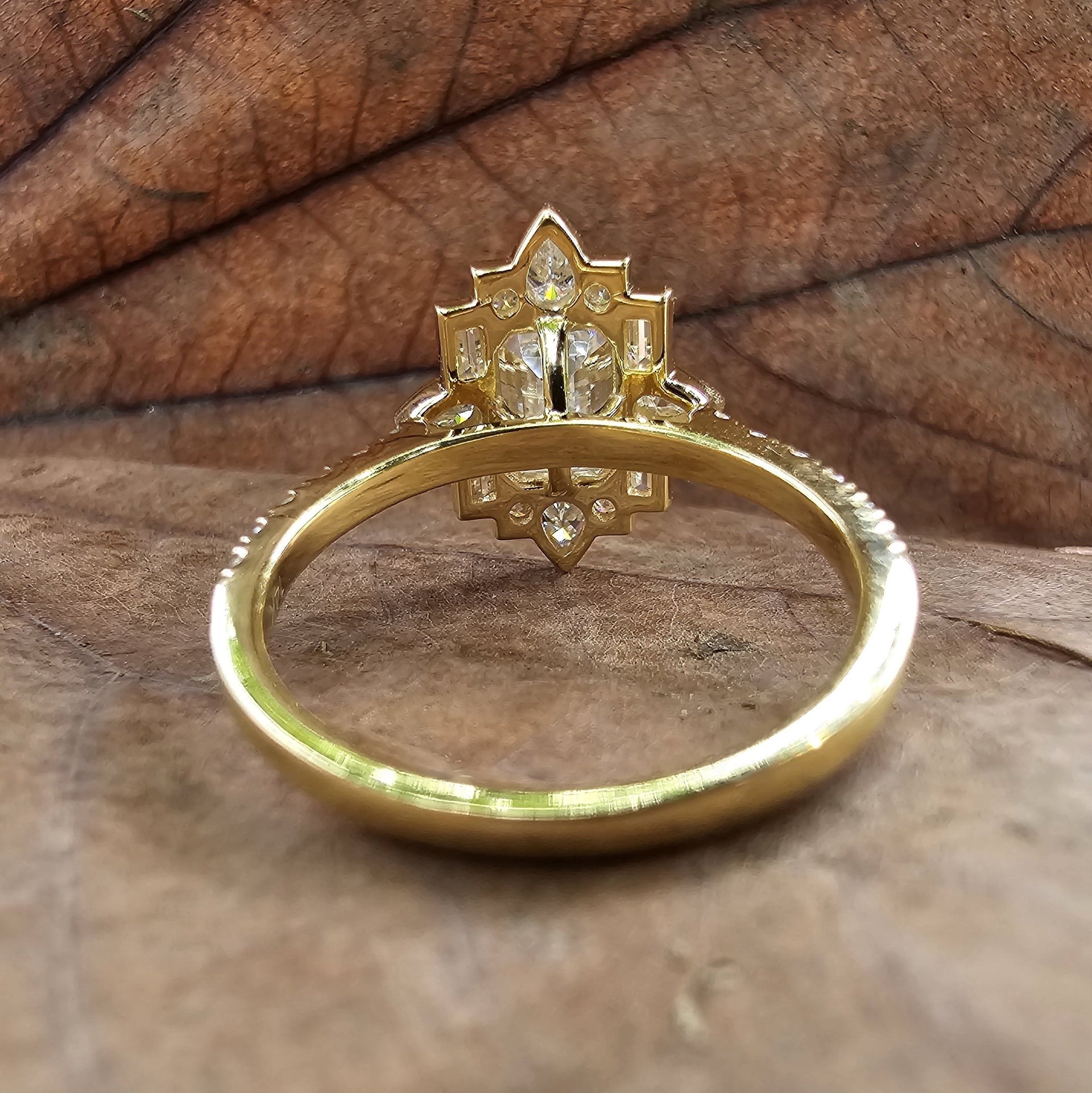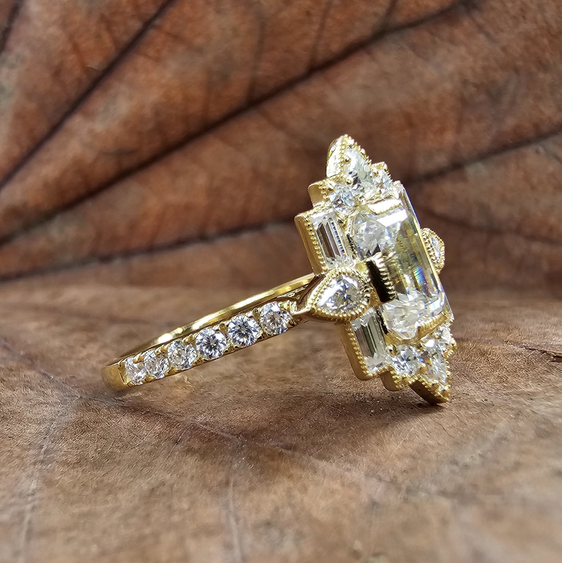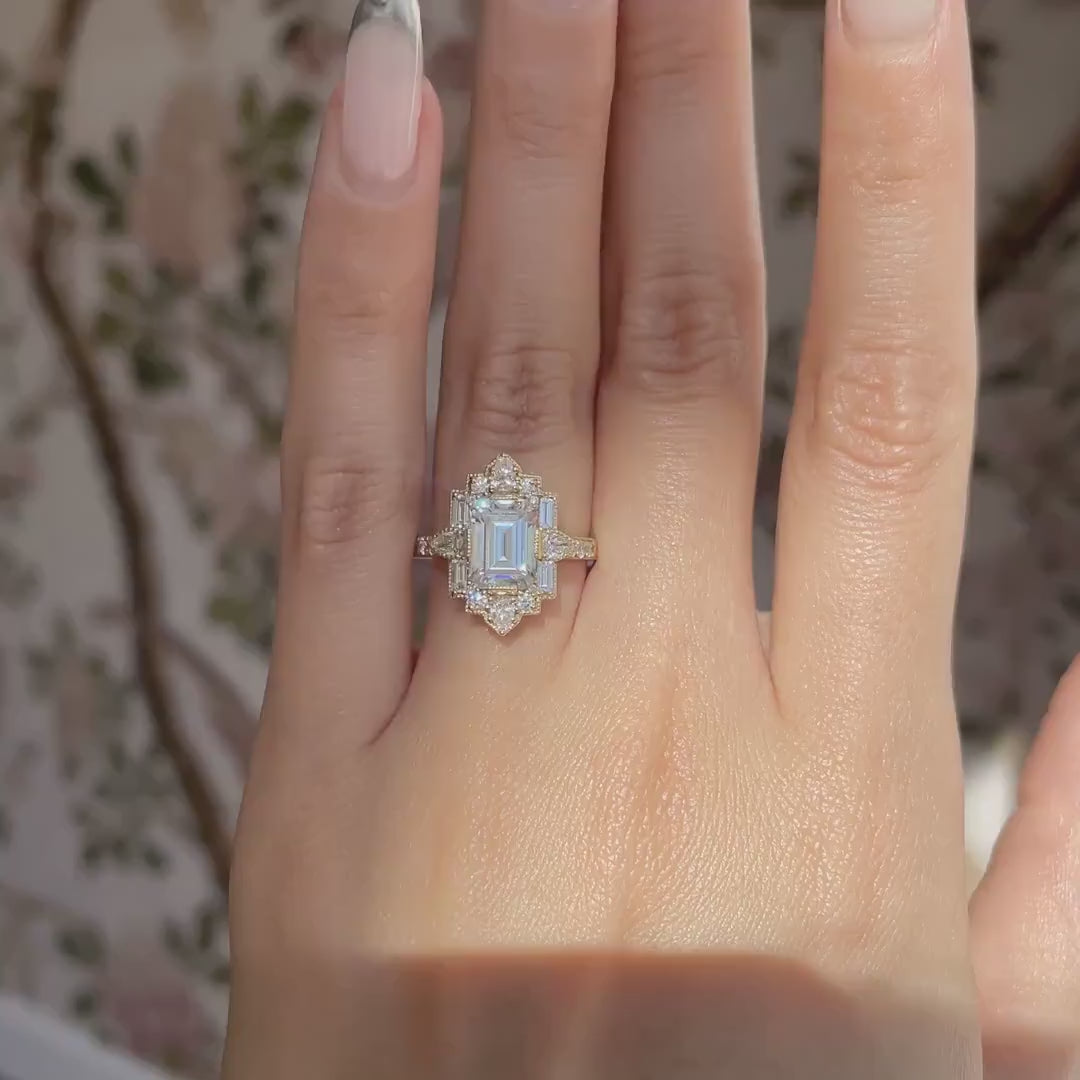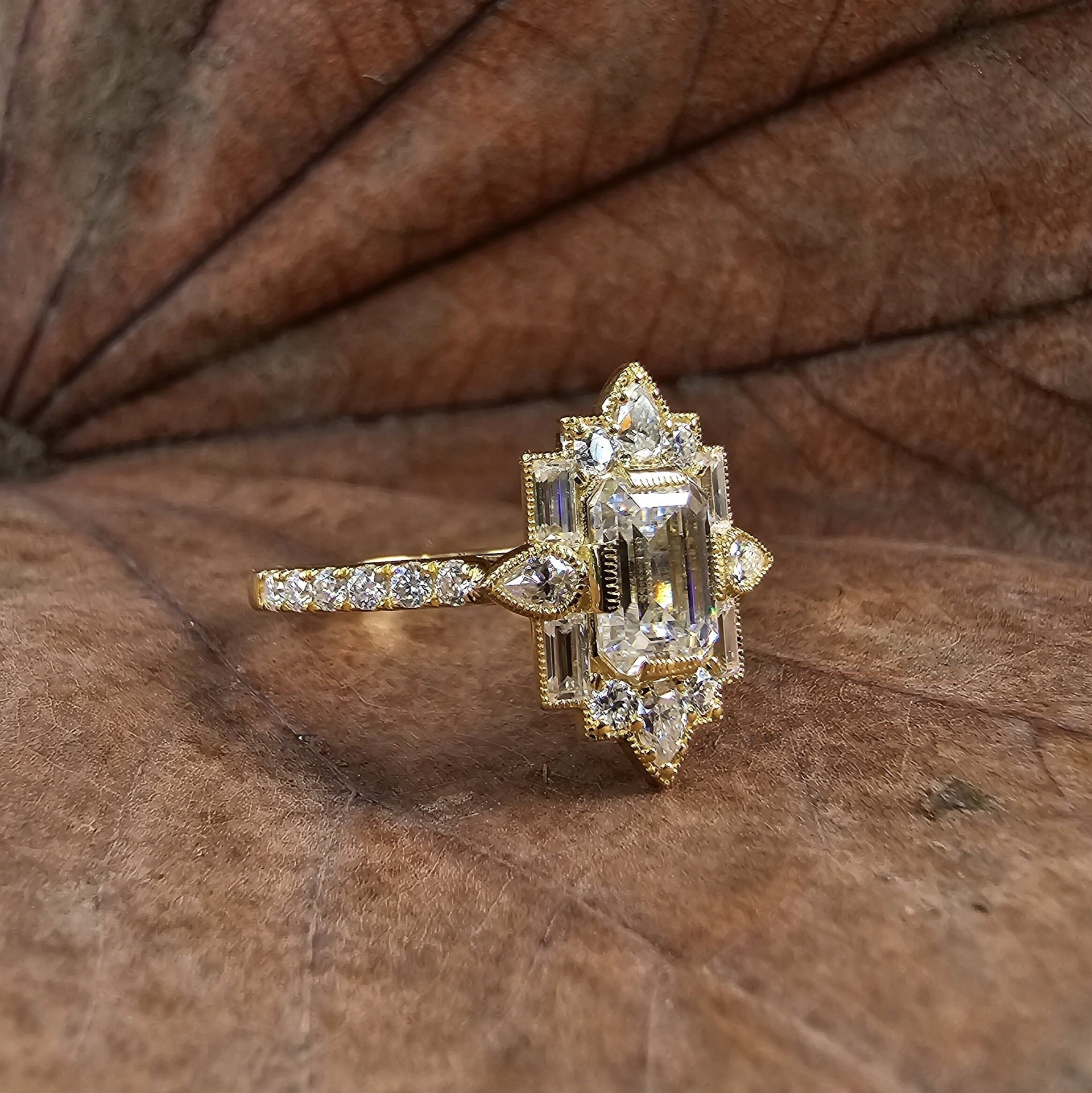 Discover timeless elegance with our Art Deco Emerald Cut Ring, featuring a stunning 1.5 CT Moissanite centerpiece and exquisite pear and round cut side stones. Crafted in a blend of 10K Gold and Sterling Silver, this ring combines classic Art Deco design with modern sophistication, making it an ideal choice for proposals, weddings, or as a standout piece in your jewelry collection.