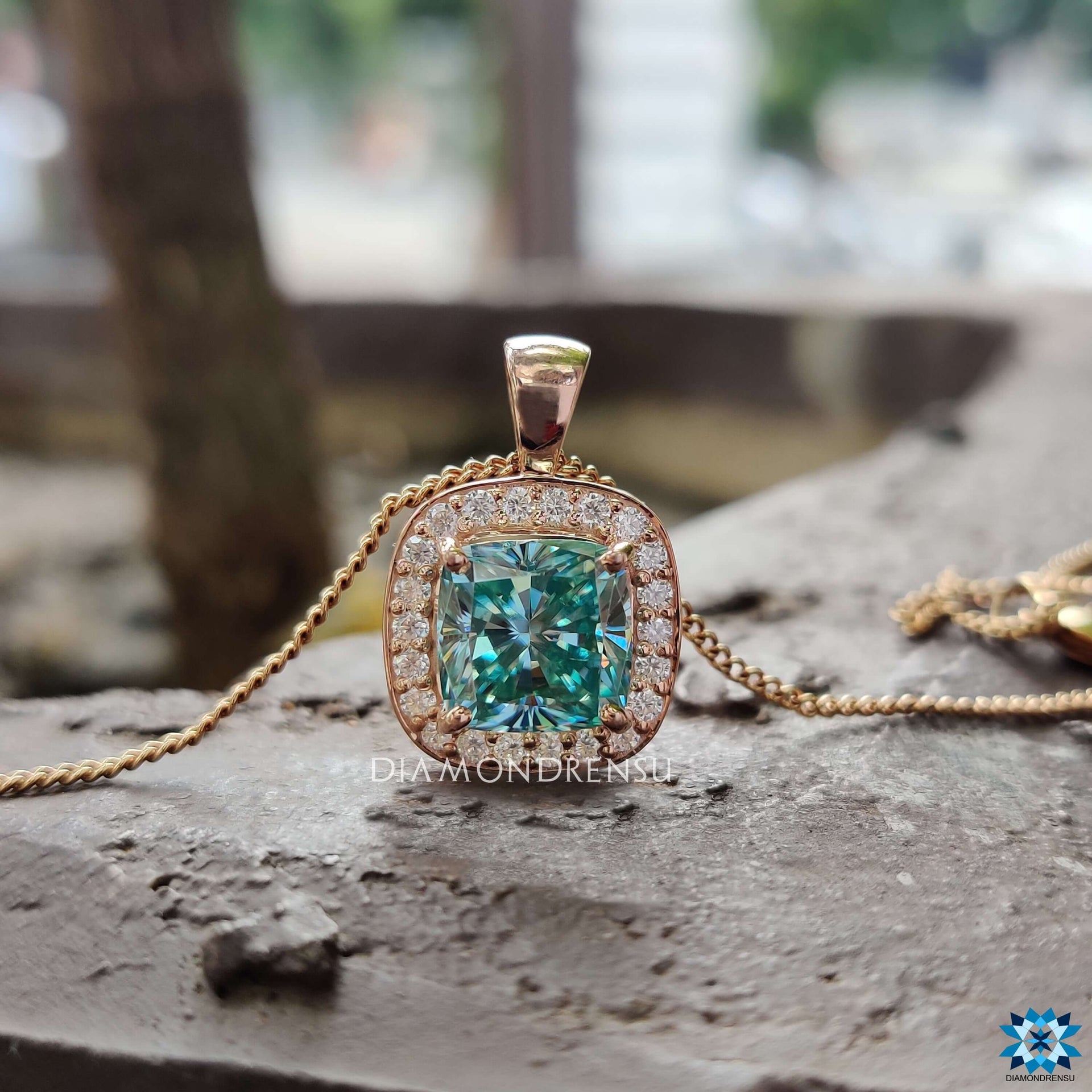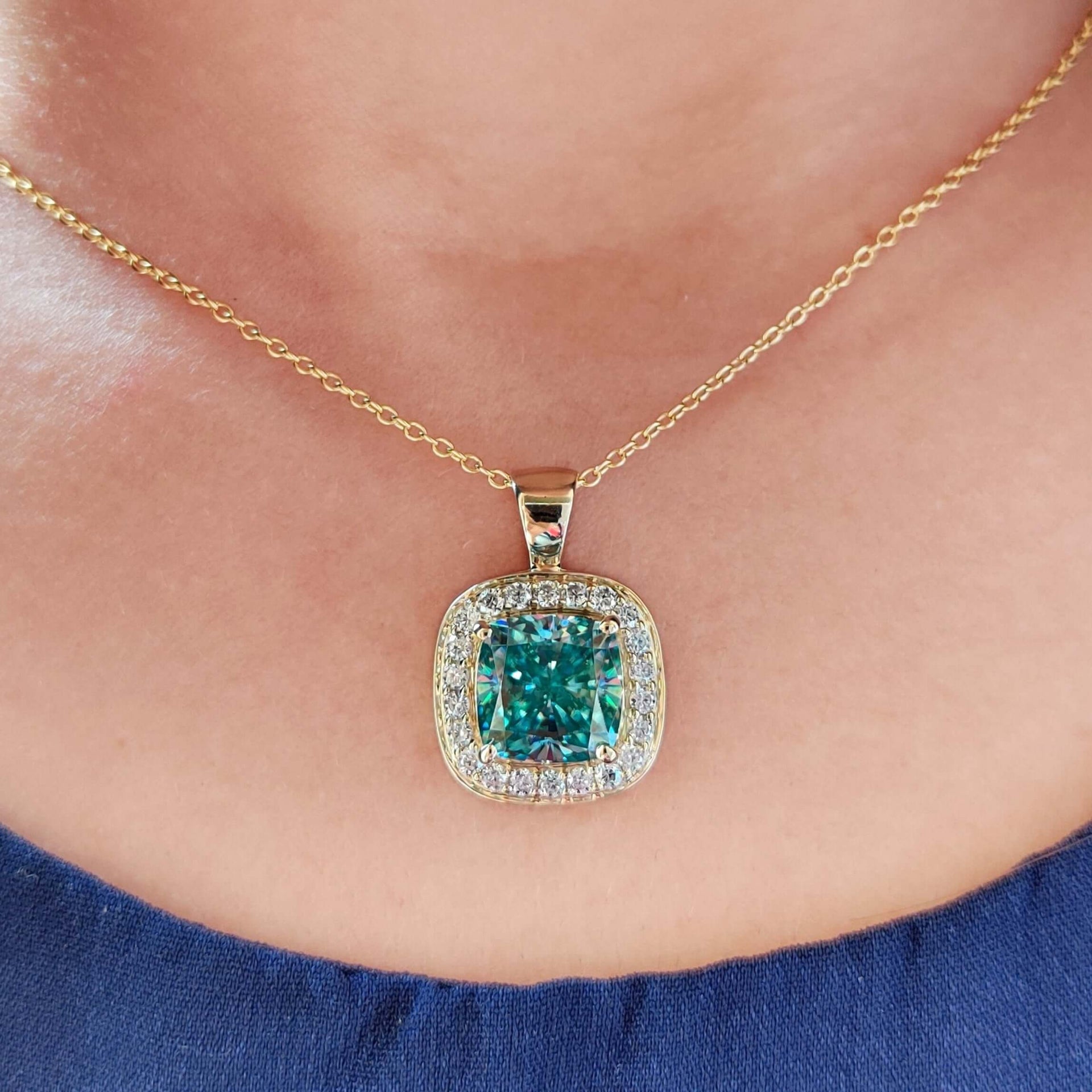 14K Gold Pendant with 3.50 Ct Cushion Cyan Blue Halo | Sterling Silver Pendant Jewelry