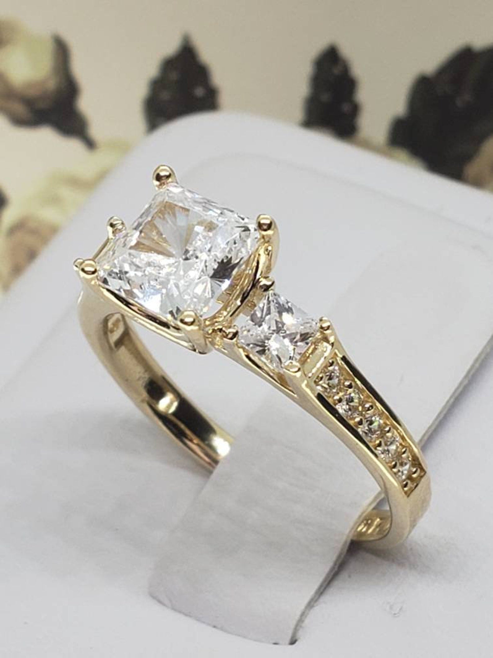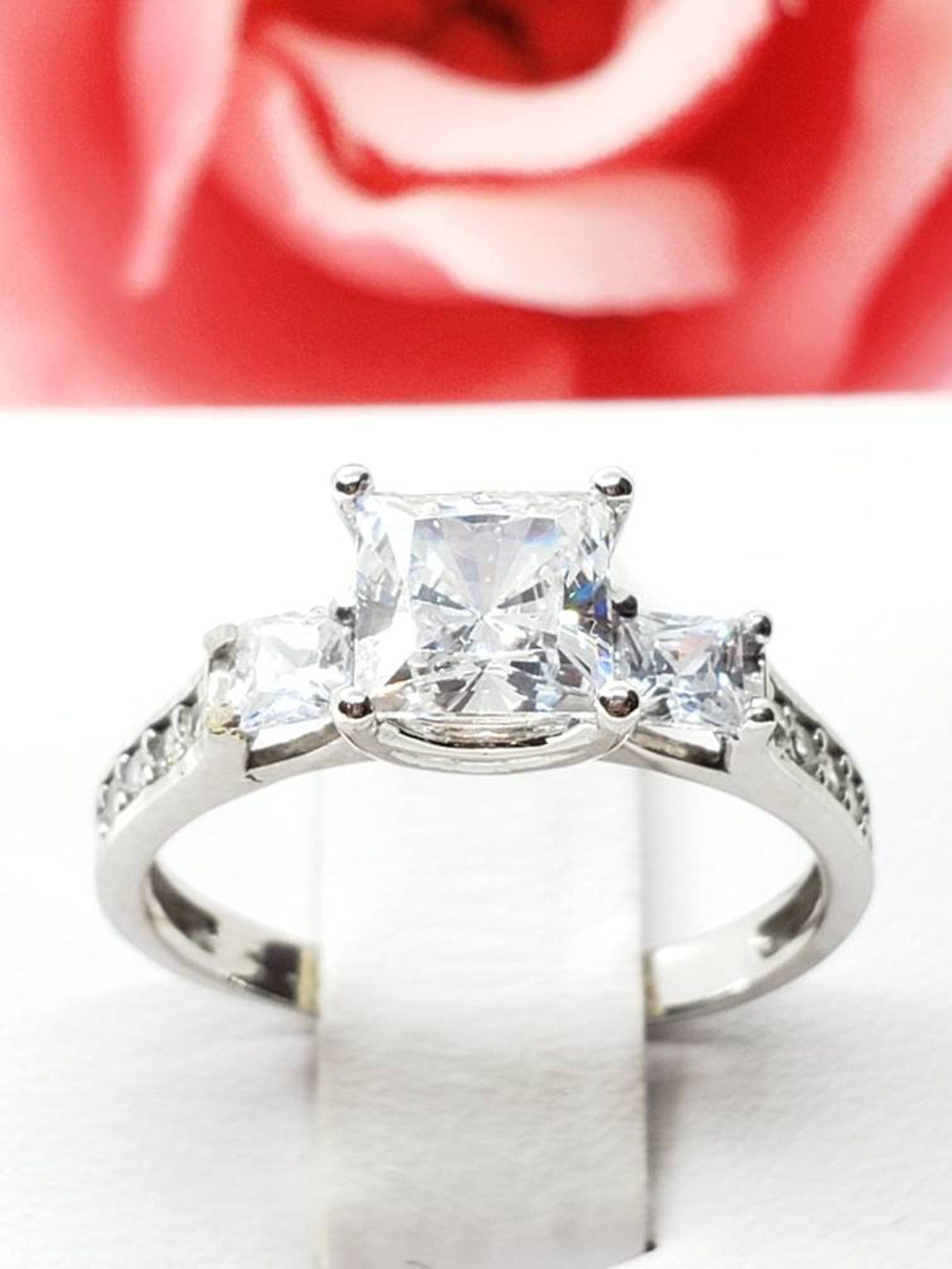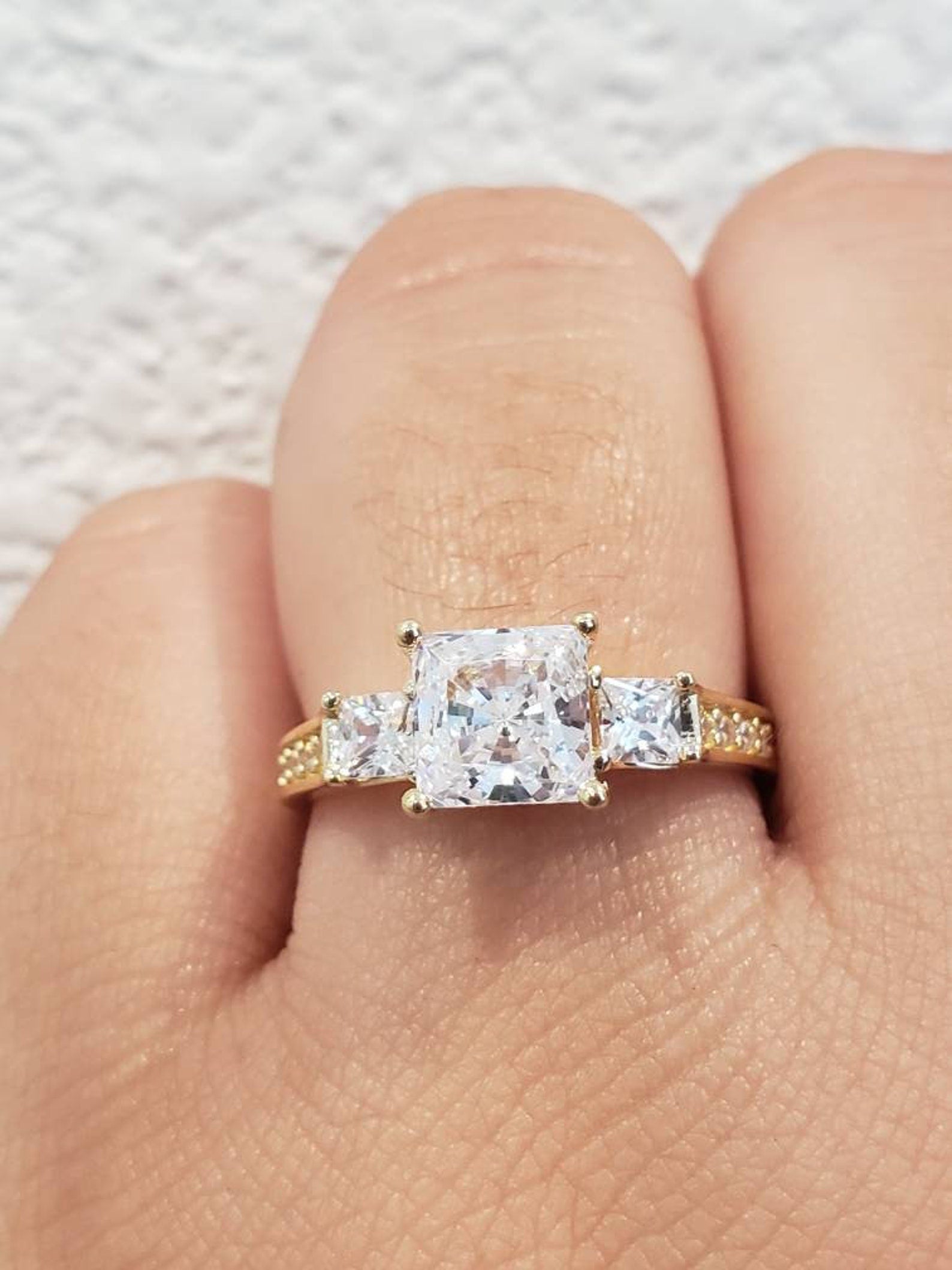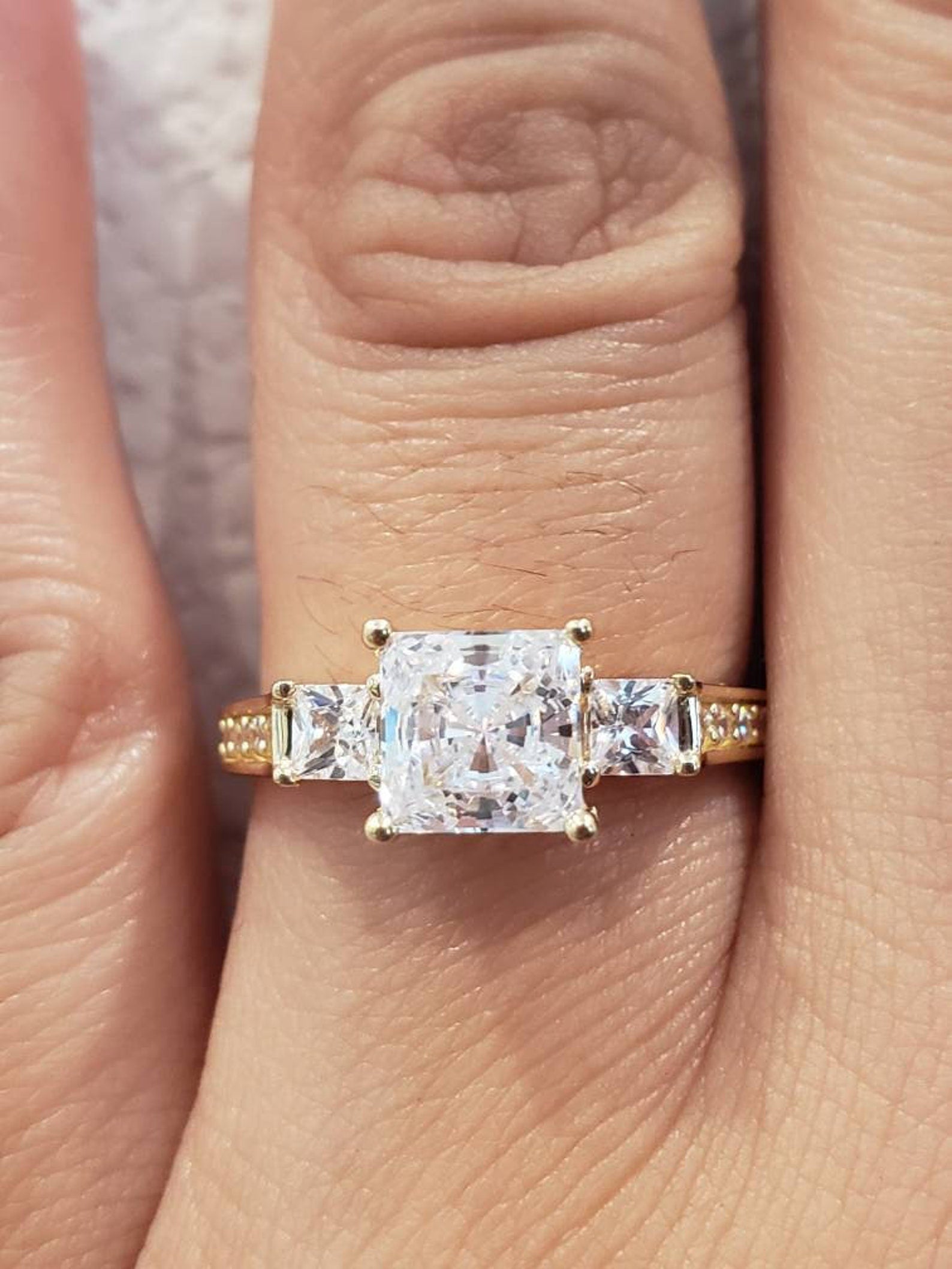 Three-Stone 3.0 Ct Princess Cut Engagement Ring for Women | Art Deco Prong Set in Solid Gold & Silver